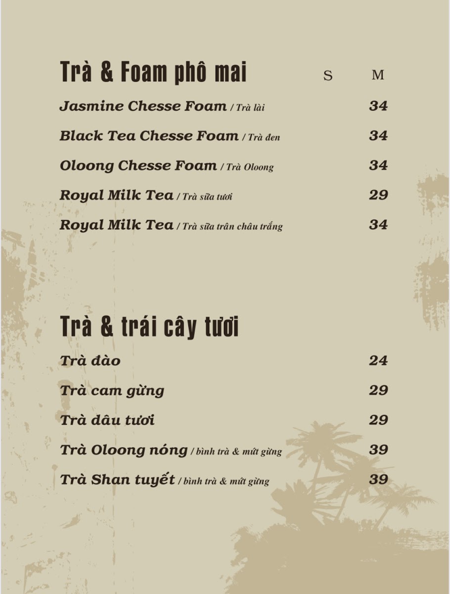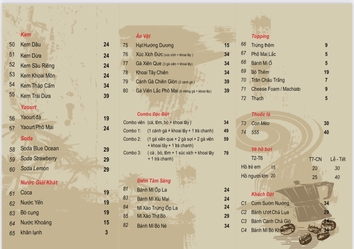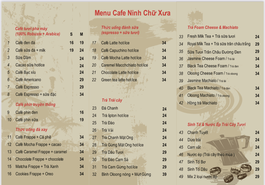 Ninh Chữ Xưa Homestay & Coffee Menu